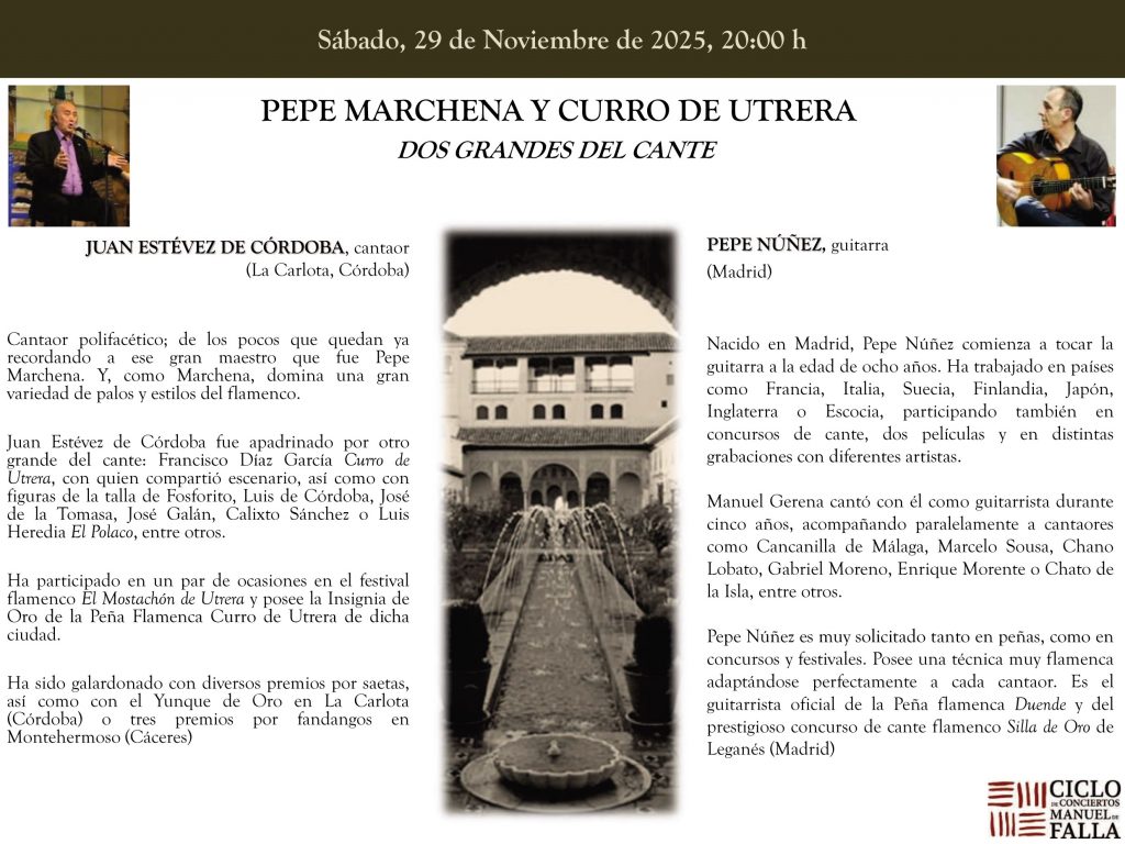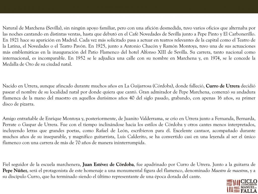Juan Estévez de Córdoba, marchenero hasta la médula, fue, en sus comienzos, apadrinado por Curro de Utrera. Acompañado por la guitarra de Pepe Núñez, no se nos ocurría nadie mejor para este homenaje conjunto a maestro y discípulo: Pepe Marchena y Curro de Utrera: dos grandes del cante.