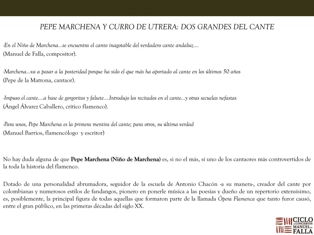 Estamos frente a uno de los pilares del cante, sin duda el más discutido, tal vez el más vituperado, y, sobre todo, el más popular e idolatrado… (Pepe) Marchena está entre la Andalucía flamenca…… y la Andalucía popular. Muy cerca, sí, de la Andalucía folklórica, pero muy, muy lejos de la pandereta.