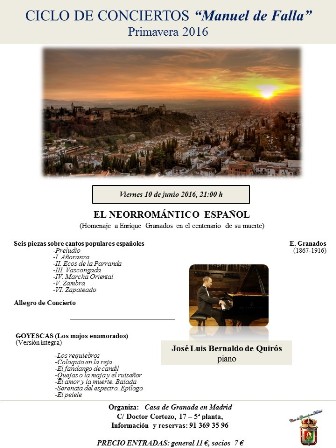 Con especial referencia a compositores y escritores granadinos o/y relacionados con Granada. Aniversarios y homenajes especiales de este 2016. Piezas para piano, canción española y zarzuela. Al final del concierto se servirá un ágape.