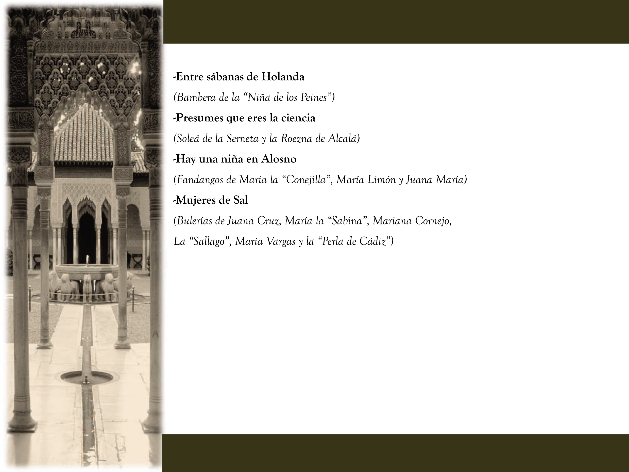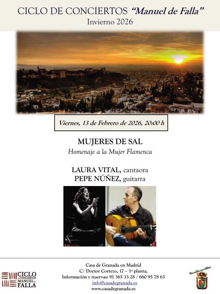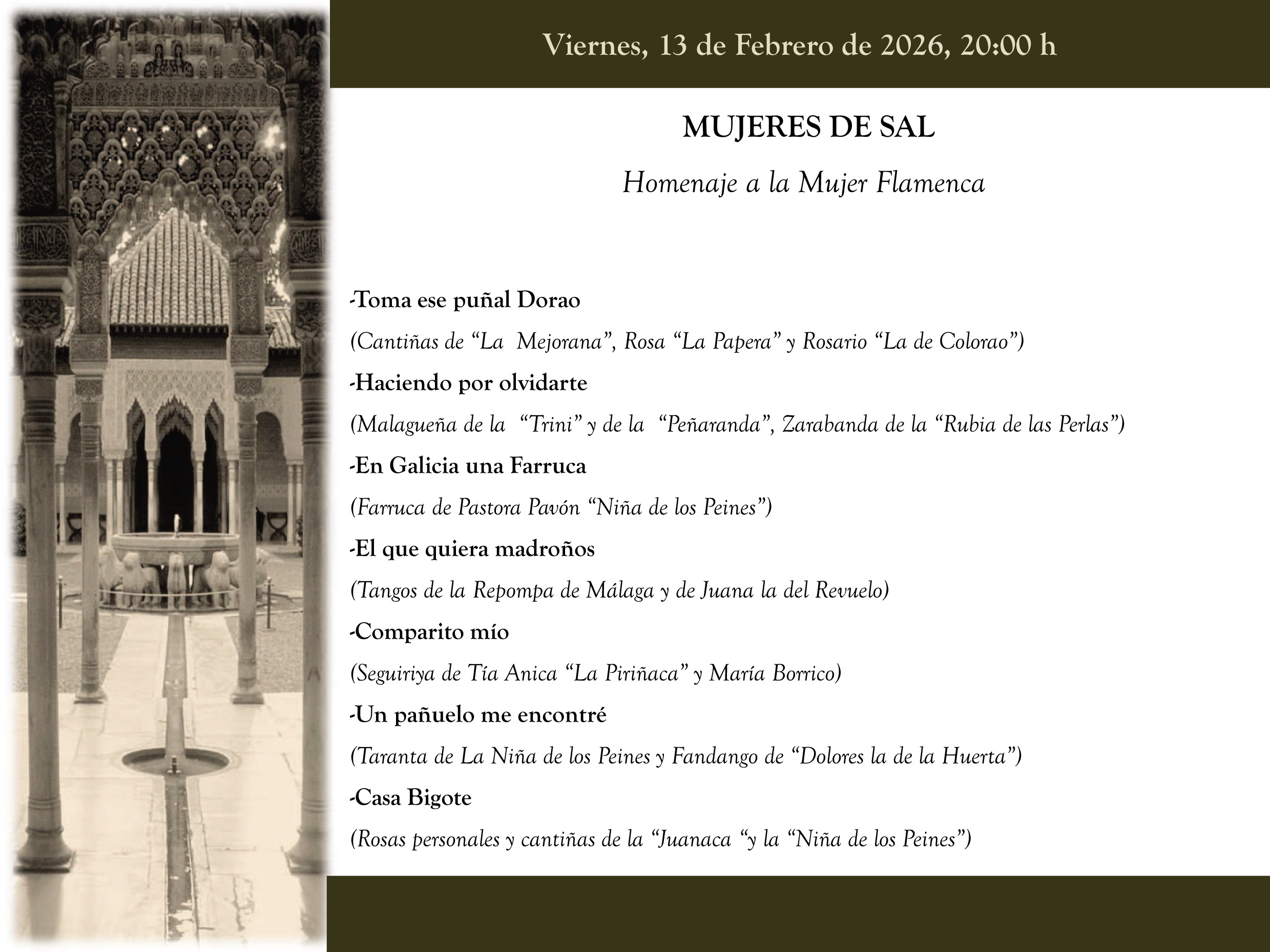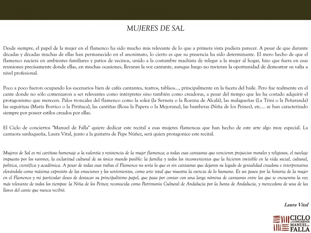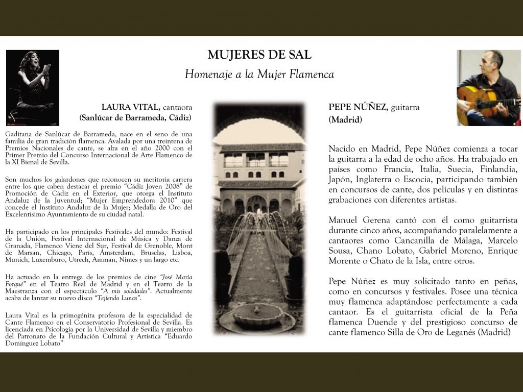 La Mujer Flamenca será la protagonista en este magnífico y originalísimo recital de cante que Laura Vital, cantaora de Sanlúcar de Barrameda, junto a la experimentada guitarra de Pepe Núñez nos ofrecerán. Con el indiscutible referente de Pastora Pavón «La Niña de los Peines», nombres como María «la Sabina», «La Perla de Cádiz» o «La Repompa de Málaga», entre otras, serán recordadas en Mujeres de Sal.