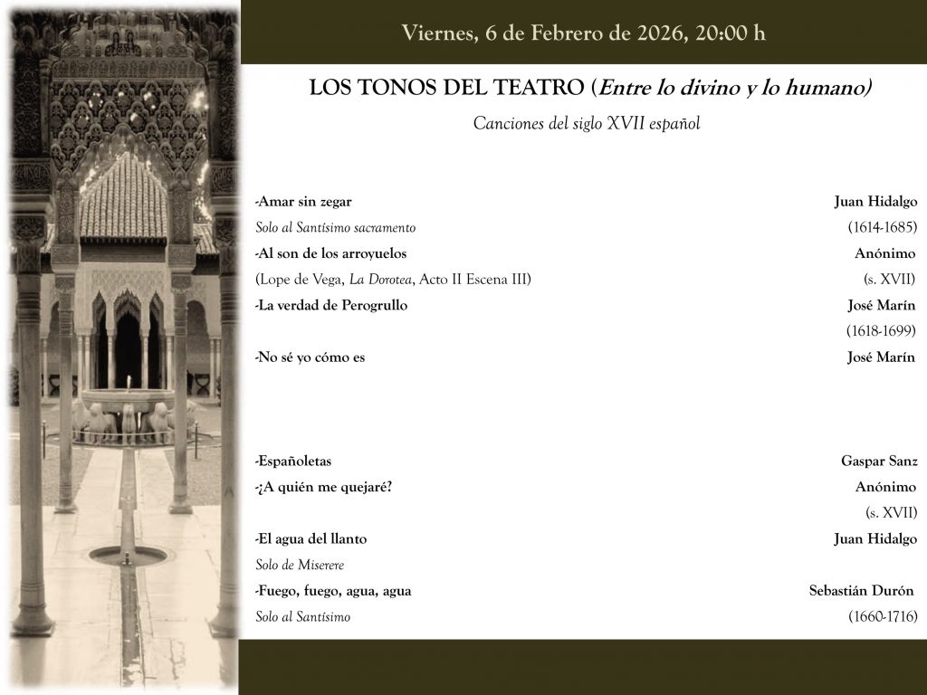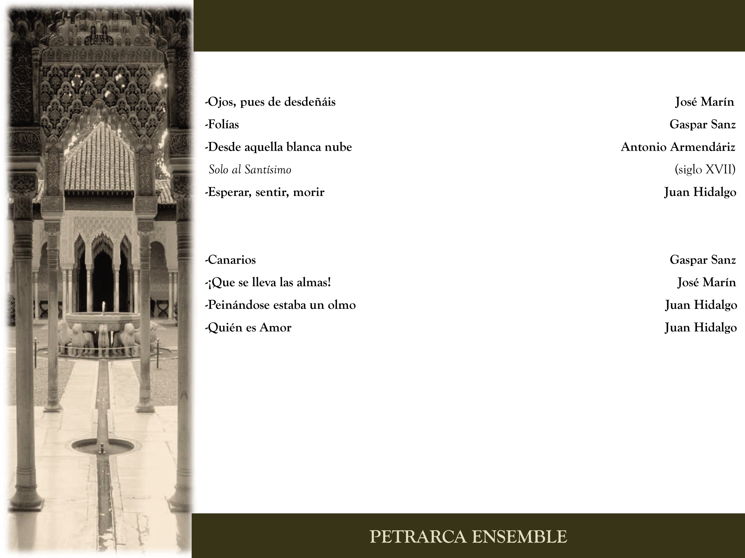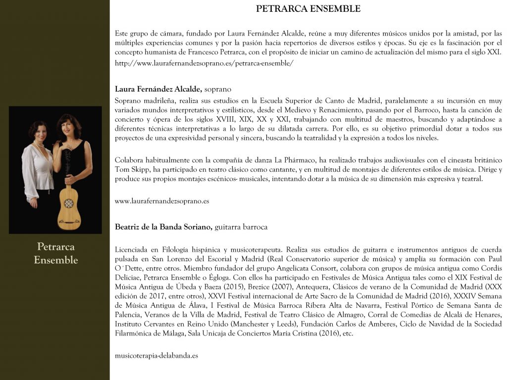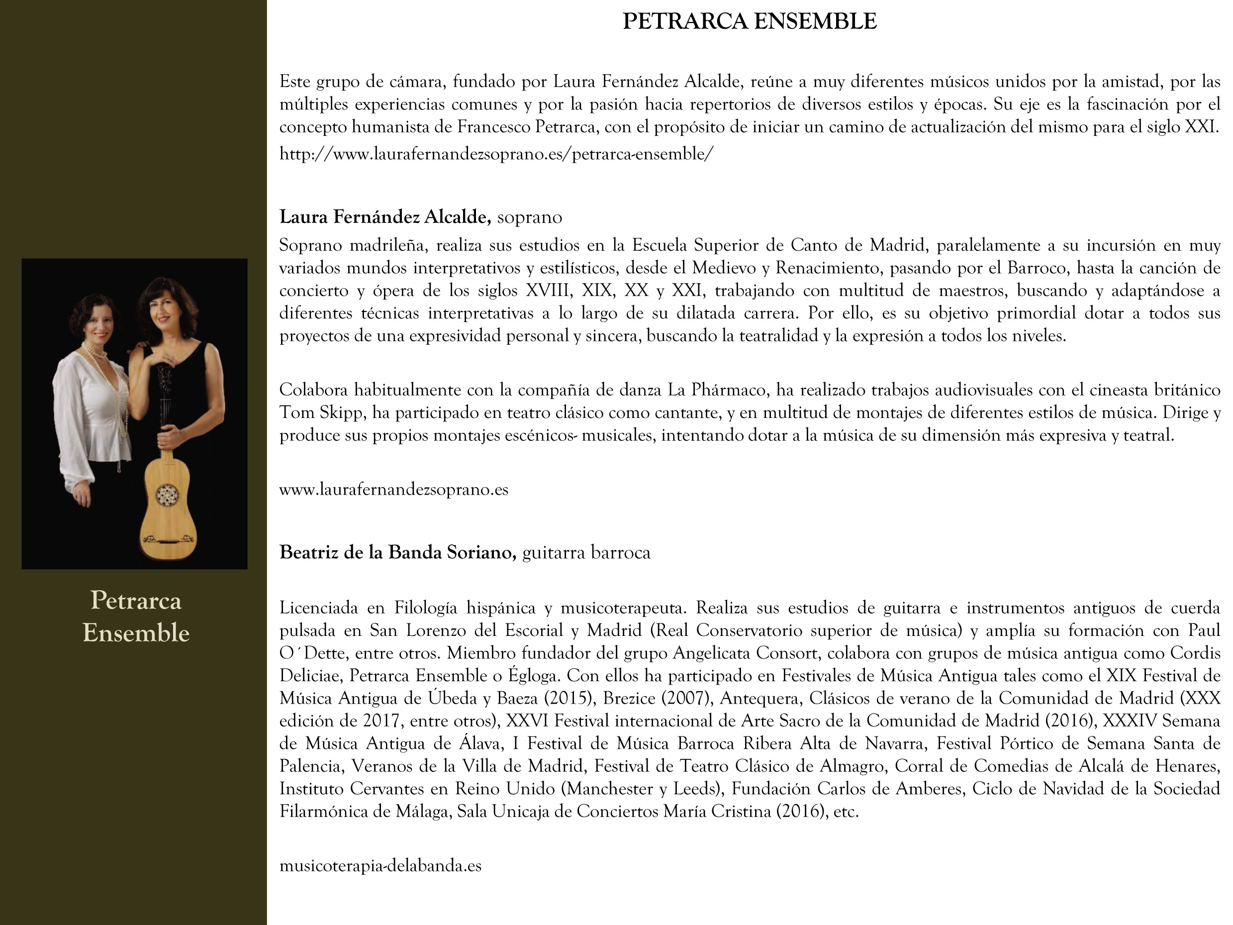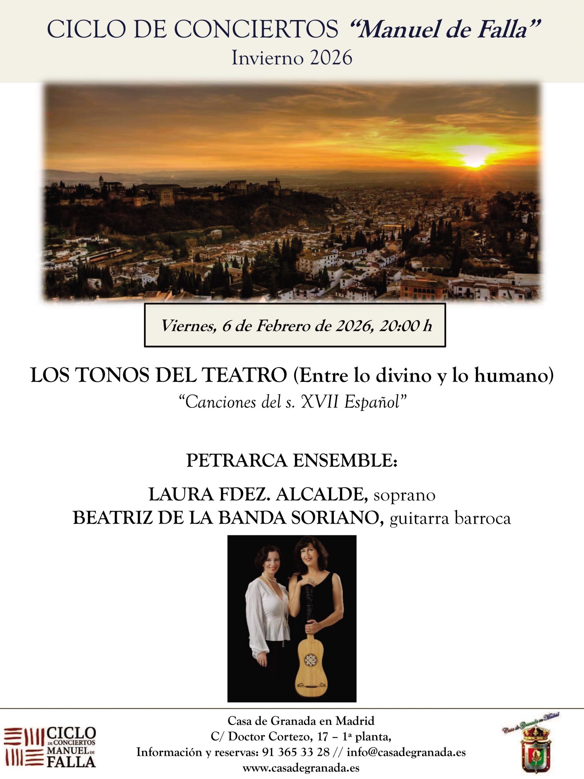Los madrileños José Marín o Juan Hidalgo son dos grandes exponentes de la música española del s. XVII. Unidos a Gaspar Sanz, auténtico referente de la guitarra barroca, o Sebastián Durón, uno de los mejores autores de música escénica de su tiempo, conforman un bellísimo programa. La soprano Laura Fdez. Alcalde junto a la guitarra barroca de Beatriz de la Banda Soriano serán las protagonistas.