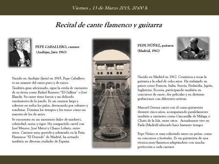 Publicado el 16 febrero, 2015 por Casa de GranadaRECITAL DE CANTE FLAMENCO Y GUITARRA EN LA CASA DE GRANADA EN MADRID RECITAL DE CANTE FLAMENCO Y GUITARRA EN LA CASA DE GRANADA EN MADRID VIERNES 13 DE MARZO 2015 , 20:00h.